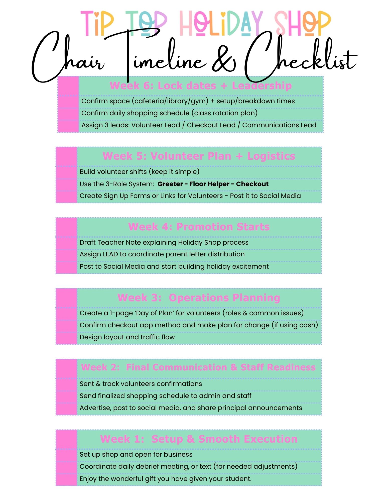 Used by elementary PTAs/PTOs to keep holiday shop week organized and calm.